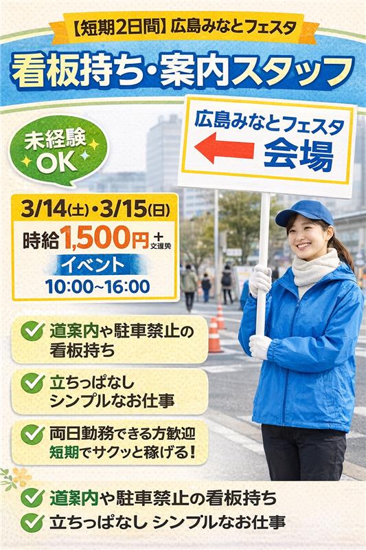 | 仕事内容 | \宇品みなと公園/ イベント来場者の方へ・・・ ・ ★1~2時間ごとに配置場所の移動あり また、トイレ休憩は好きなタイミングでOKなので安心して働けます。 特別な経験や資格は不要! 未経験の方も、当日は指示がありますのでご安心ください。 |